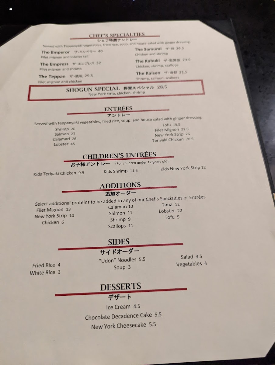 For younger guests, the children's dinner options, including Kid's Steak and Chicken Teriyaki, are both delicious and affordable. Complement your meal with flavorful side orders, such as lobster and miso soup, or indulge in unique desserts like the Chocolate Decadence Cake. Enjoy the inviting ambiance, attentive service, and a menu that ensures a memorable culinary journey.